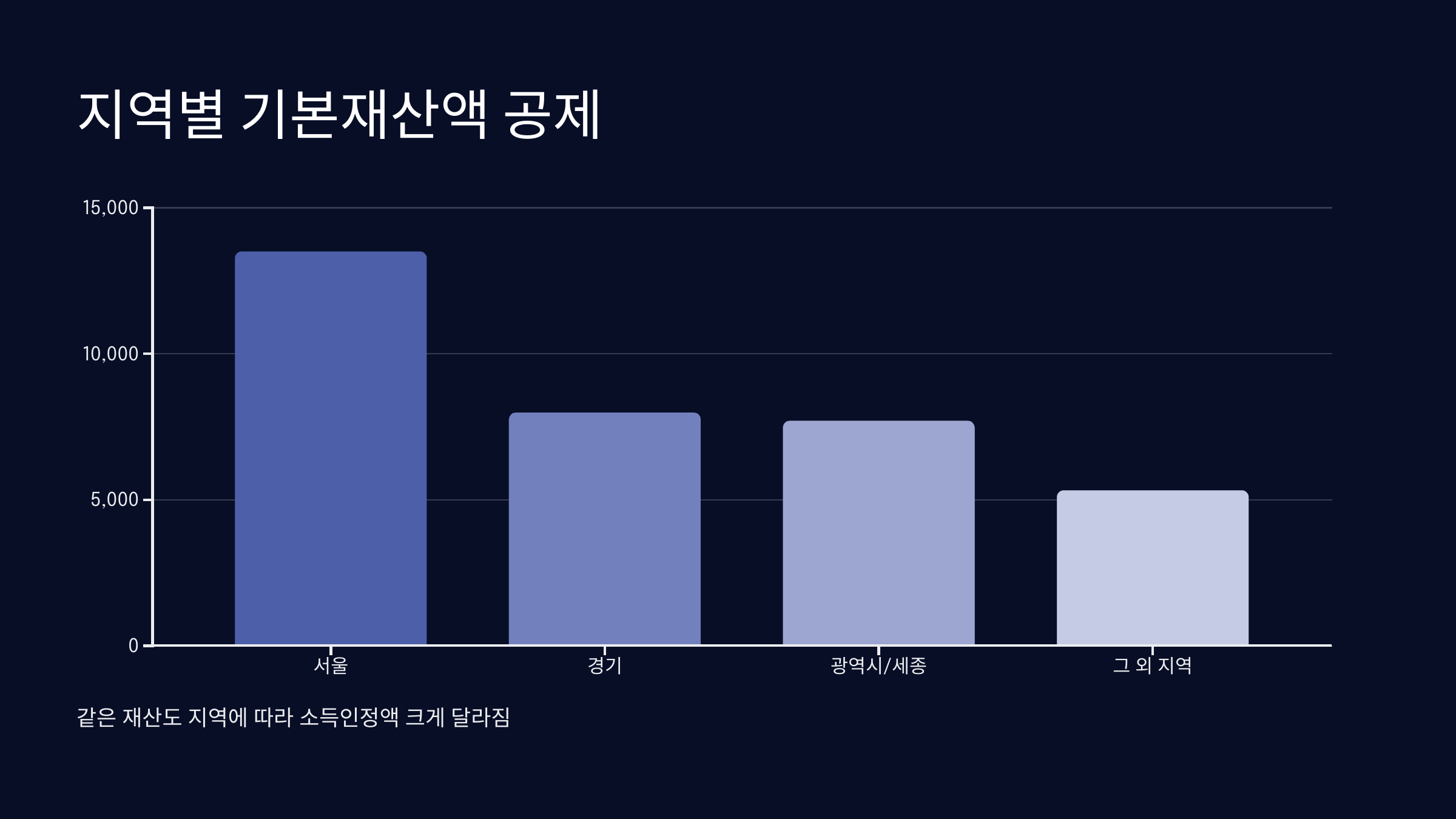 기본재산액 공제는 지역마다 크게 달라요. 서울은 1억 3,500만 원, 경기도는 8,000만 원, 농어촌은 7,250만 원까지 재산으로 보지 않고 공제해 줘요. 같은 재산을 가져도 어디 사느냐에 따라 소득인정액이 달라지는 거죠.