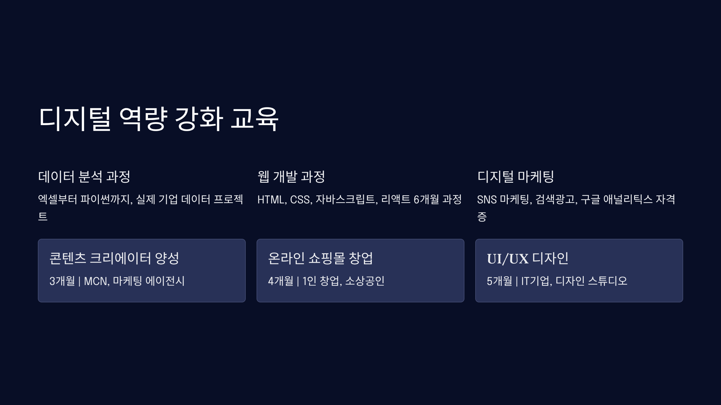 | 콘텐츠 크리에이터 양성 | 3개월 | MCN, 마케팅 에이전시 |