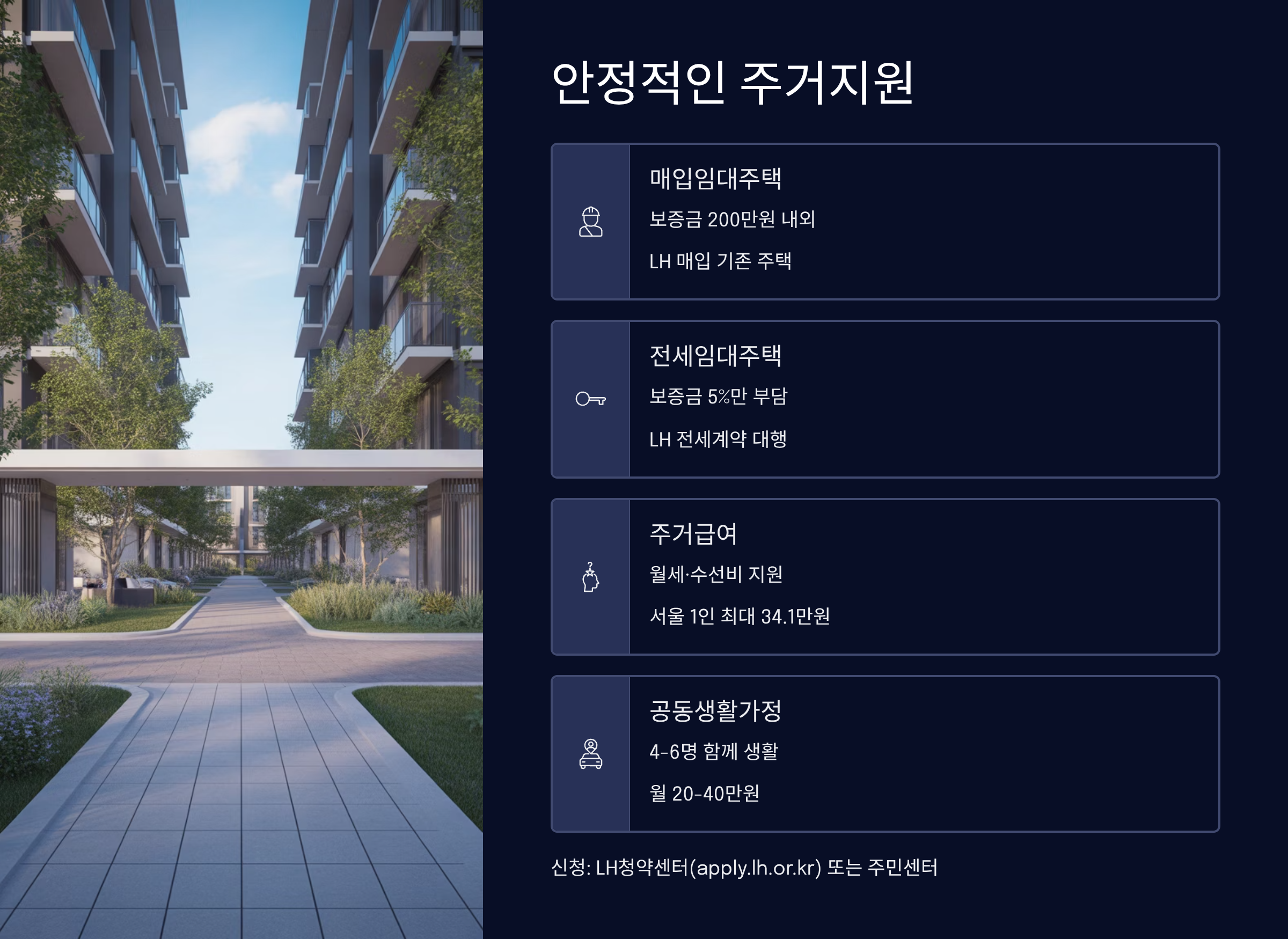 - 영구임대주택: 최저소득층 대상, 보증금 200-300만원